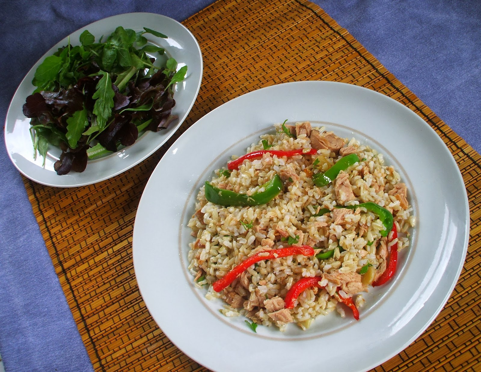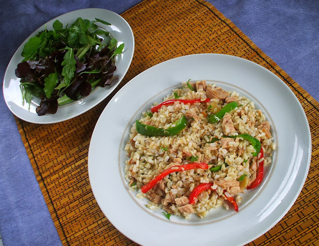 | Numa saladeira colocar o arroz e juntar o atum escorrido.